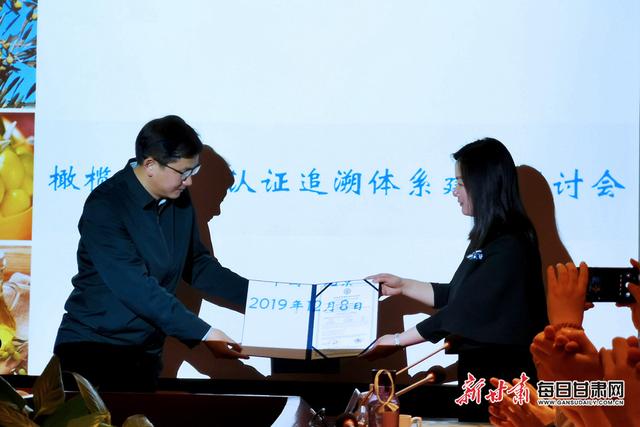 會上,主辦方向隴南市祥宇油橄欖開發(fā)有限責任公司頒發(fā)了中國首張?zhí)丶壋跽ラ蠙煊驼J證證書。