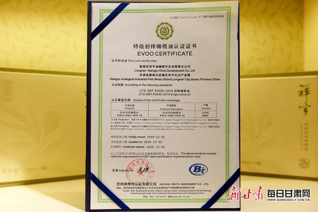 隴南市祥宇油橄欖開發(fā)有限責任公司獲得特級初榨橄欖油認證證書